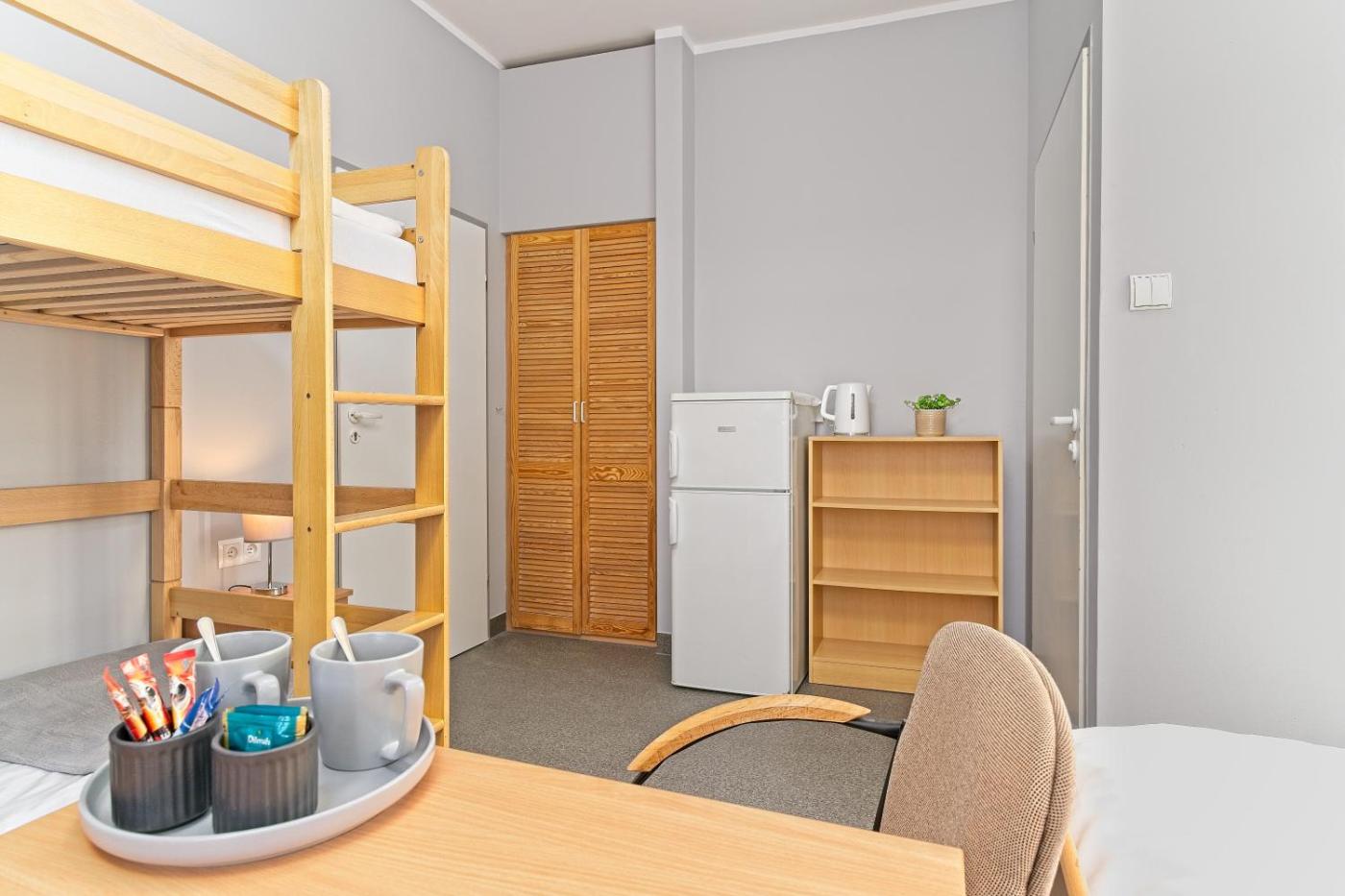 Pokój czteroosobowy z prywatną łazienką poza pokojem. Ten pokój czteroosobowy wyposażony jest w czajnik elektryczny. Prywatna łazienka znajduje się w korytarzu. Pokój Czteroosobowy - 4 osobowy. Powierzchnia pokoju ok.: 15 mkw. ;