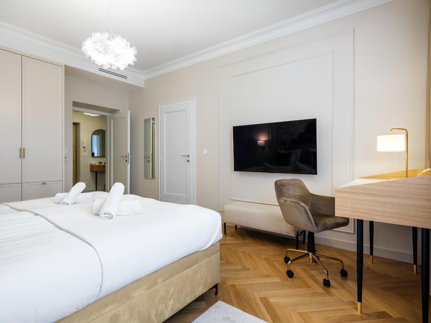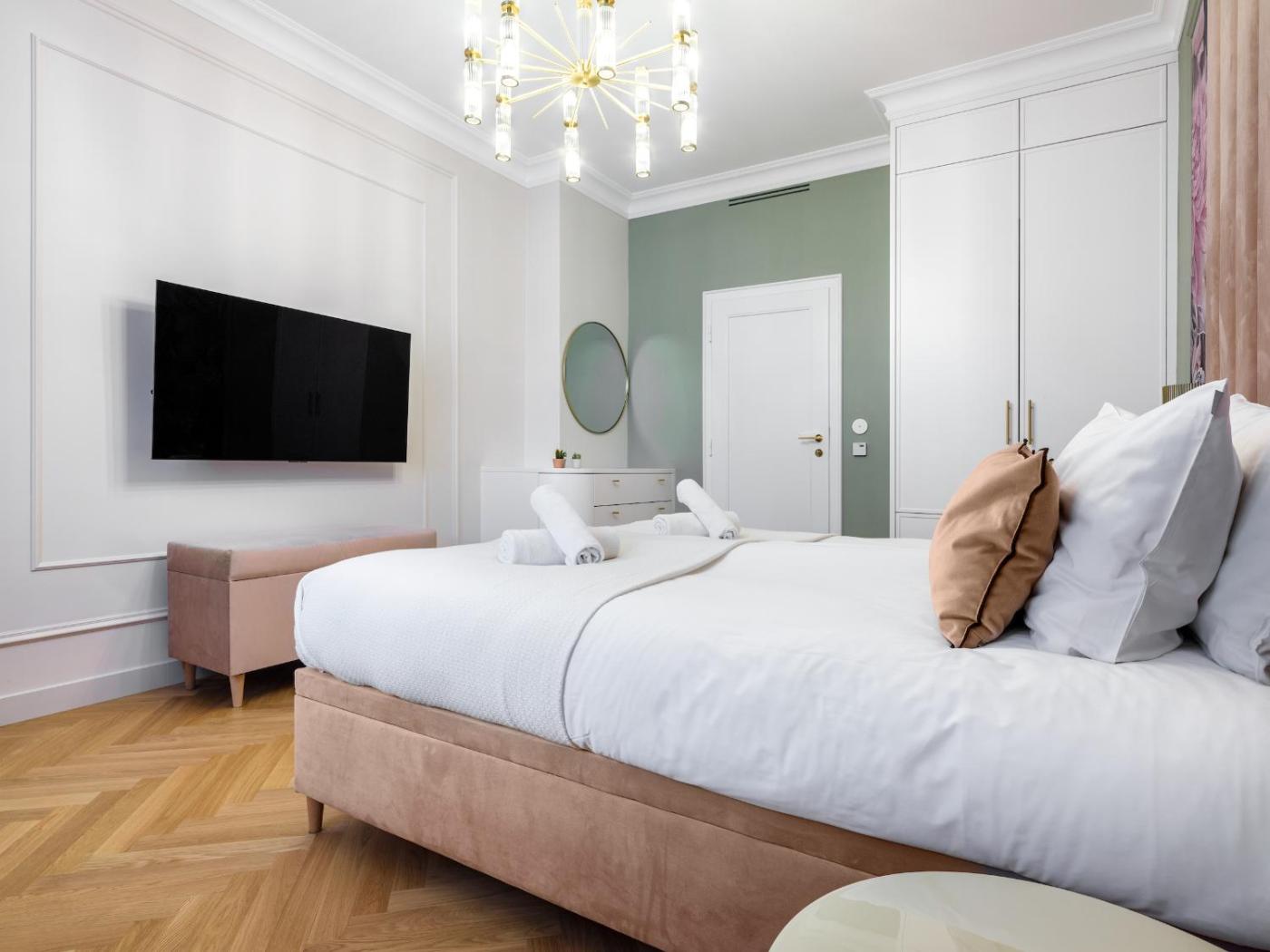 Apartament z 4 sypialniami i balkonem. Featuring a private entrance, this air-conditioned apartment is comprised of 2 living rooms, 4 separate bedrooms and 2 bathrooms with a bath and a shower. The well-fitted kitchenette features a stovetop, a refrigerator, a dishwasher and kitchenware. The spacious apartment offers a flat-screen TV, a washing machine, a tea and coffee maker, a seating area as well as ancourtyard view. The unit offers 5 beds. Apartament - 8 osobowy. Powierzchnia pokoju ok.: 140 mkw. ;