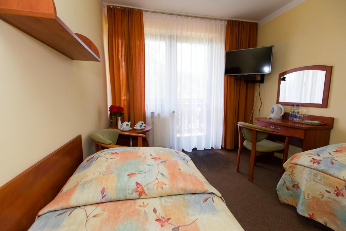 Pokój z 2 łóżkami pojedynczymi. Ten pokój obejmuje łazienkę z prysznicem i suszarką do włosów. Jest on wyposażony w telewizor z dostępem do kanałów satelitarnych. Dla Gości przygotowano szlafrok. Z okien roztacza się widok na góry. Pokój z 2 łóżkami pojedynczymi - 2 osobowy. Powierzchnia pokoju ok.: 14 mkw. ;